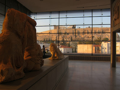 It’s really well done. On the first floor, a glass floor allows you to walk over some ancient foundations. The floor slopes up to the second level to symbolize ascending the rock, and it is all filled with artifacts found on the Acropolis. The most impressive top floor houses the Parthenon marbles—two levels of friezes that wrapped around the entire Parthenon. They are situated exactly as they appeared on the building, with even the same cardinal orientation. Glass walls give you a spectacular view of the Parthenon itself and the natural light that fills the hall illuminates them exactly the same way so it is really an integrated experience.